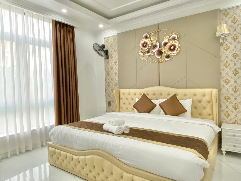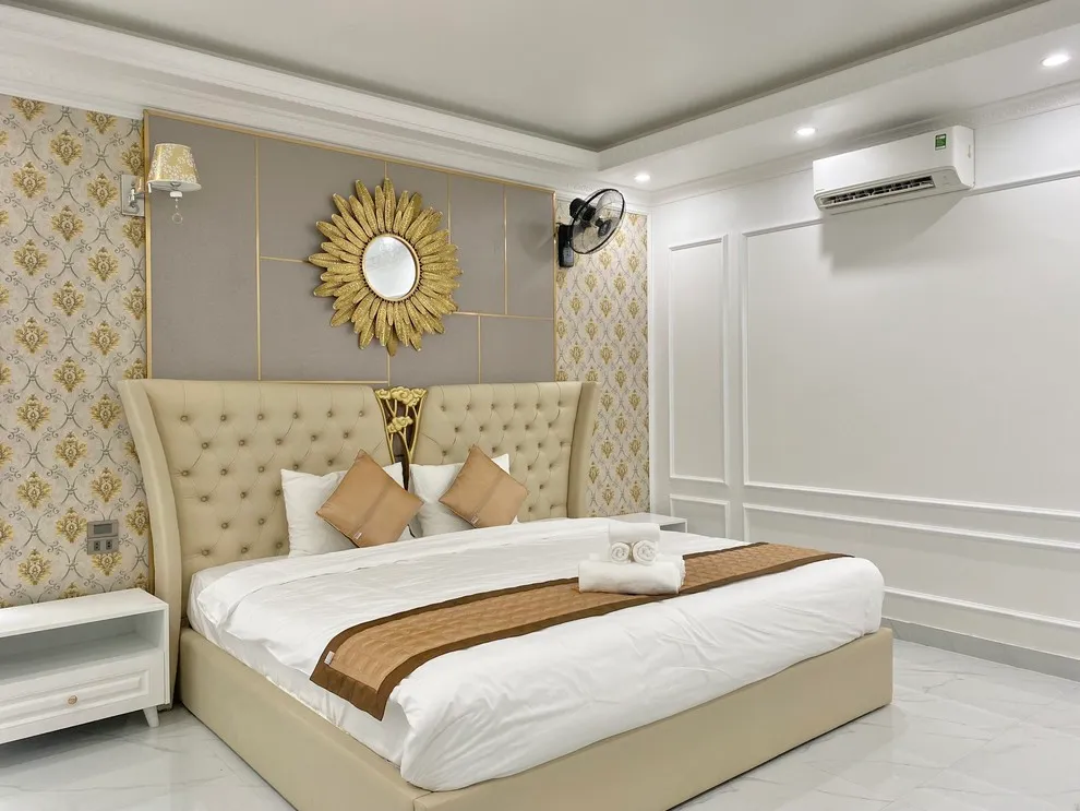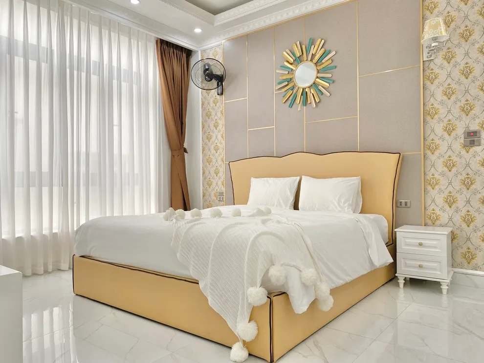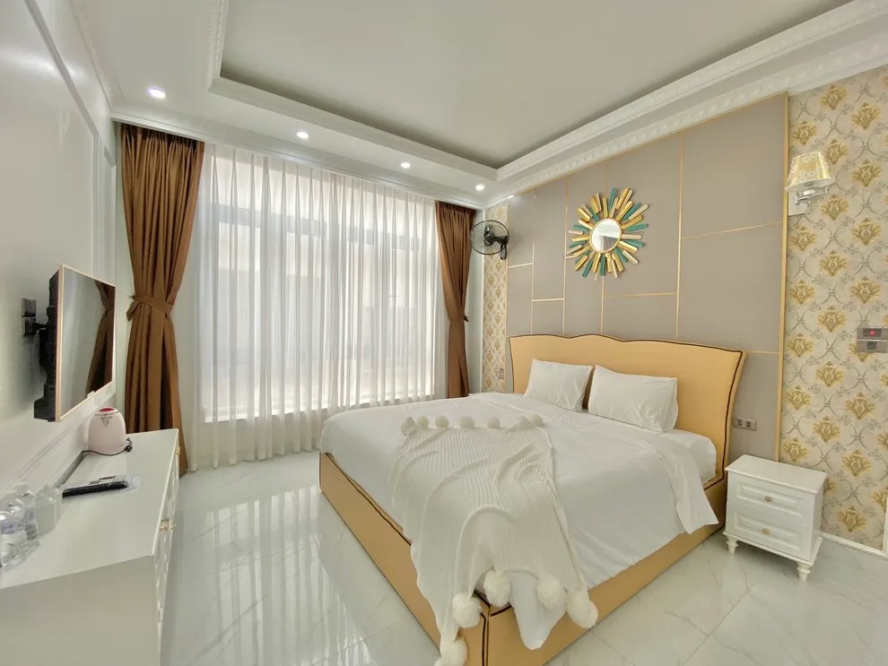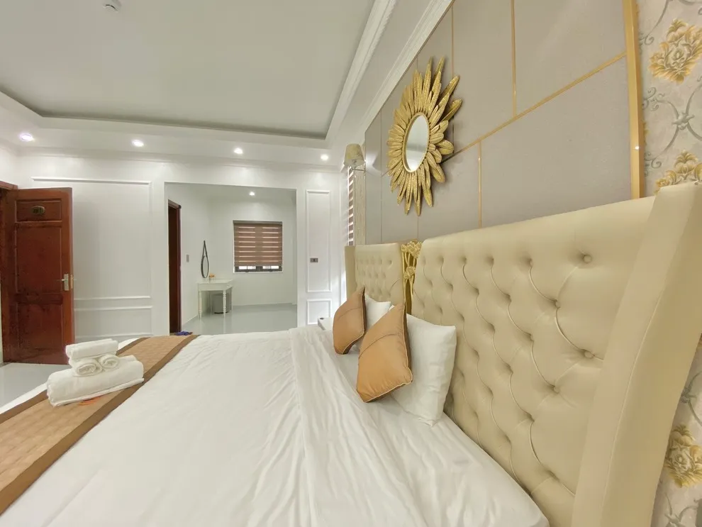 Với quy mô 09 phòng ngủ lớn, villa đảm bảo không gian nghỉ ngơi riêng tư tuyệt đối cho mọi thành viên. Cơ cấu phòng bao gồm 08 phòng ngủ Double với giường lớn và 01 phòng ngủ Twin có 2 giường lớn, tất cả đều được tích hợp đầy đủ tiện nghi như Smart TV và Internet Wifi tốc độ cao. Không gian ẩm thực tại đây cũng được chú trọng đặc biệt với phòng bếp và phòng ăn trang bị đầy đủ dụng cụ từ bếp nấu, bát đĩa, lò nướng đến nồi cơm điện và bếp lẩu, giúp du khách tự do trổ tài nấu nướng như đang ở chính ngôi nhà của mình.