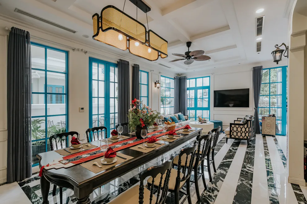 Bên trong biệt thự là không gian sống đẳng cấp với 05 phòng ngủ sang trọng, được trang bị hệ thống điều hòa trung tâm hiện đại và 06 phòng tắm đầy đủ tiện nghi khép kín. Cơ cấu giường linh hoạt (02 giường 1,8m và 03 giường 1,6m) đảm bảo sự riêng tư và thoải mái cho đoàn khách từ 10 đến 20 người. Phòng khách rộng lớn là nơi lý tưởng cho những buổi hội ngộ, kết hợp cùng hệ thống loa kéo Karaoke sôi động, giúp gắn kết các thành viên trong suốt kỳ nghỉ.