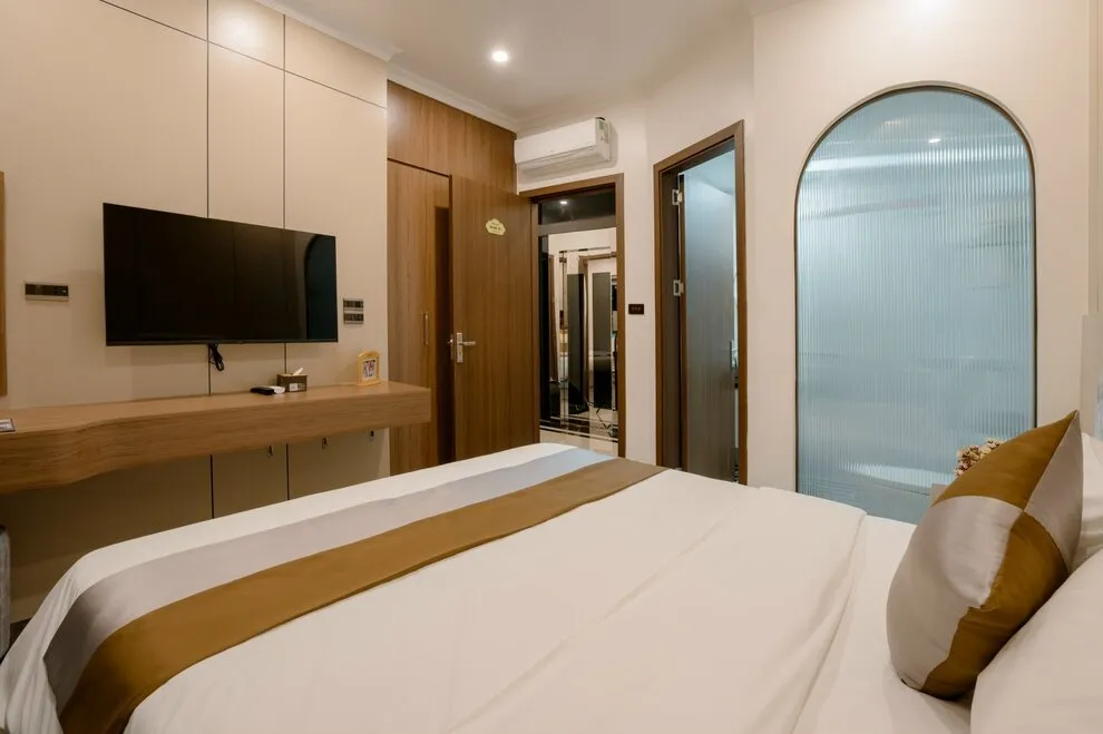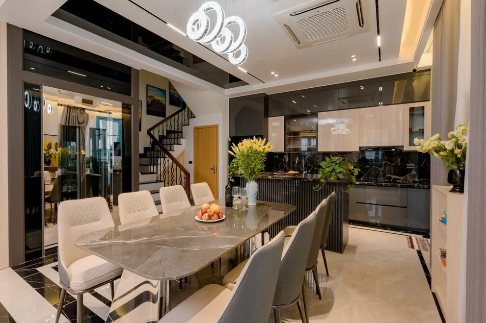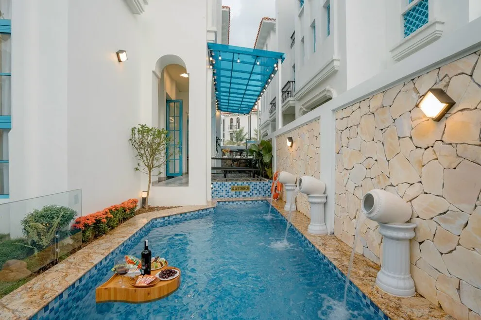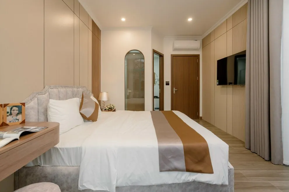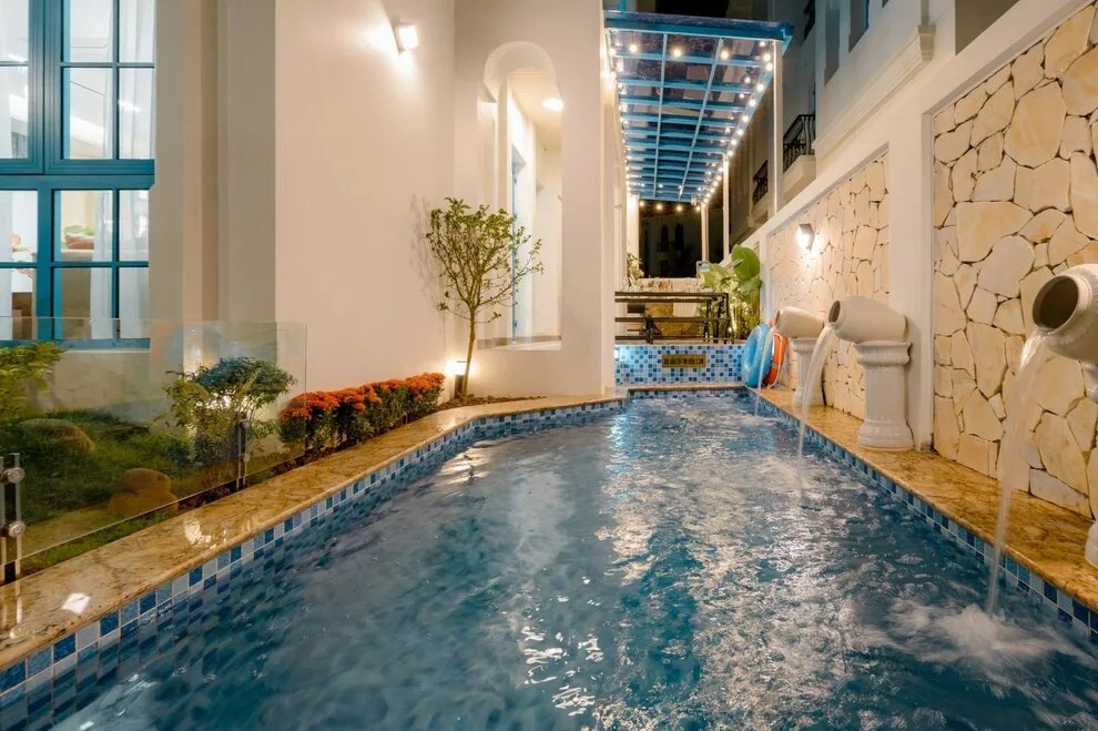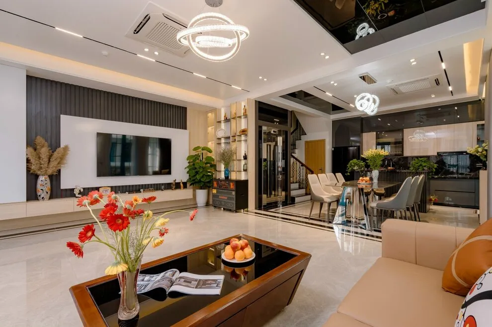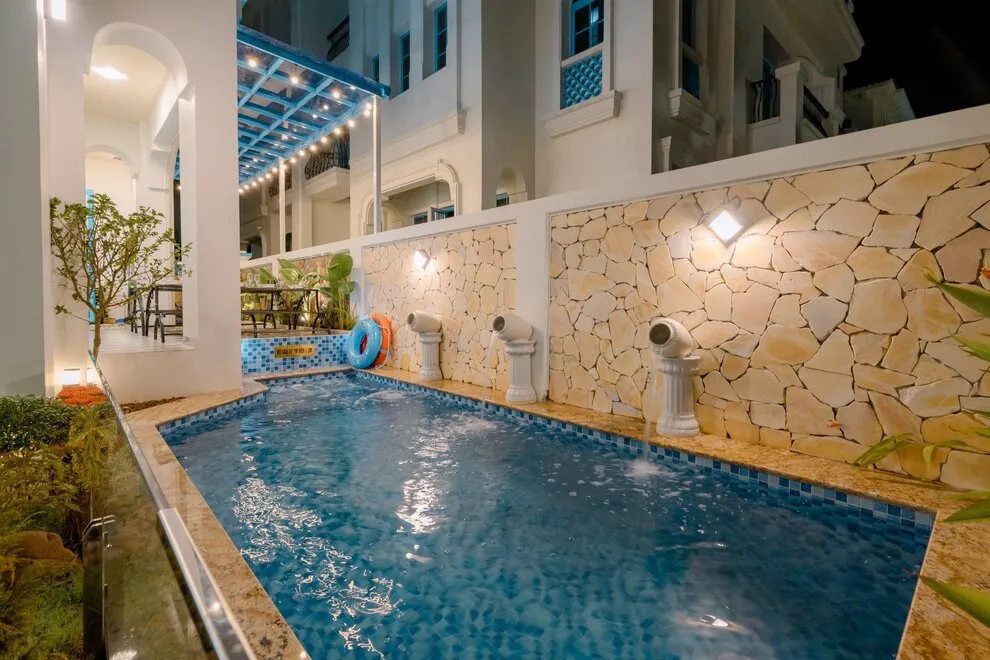 Không gian sinh hoạt chung tại biệt thự được chăm chút tỉ mỉ để trở thành tâm điểm của sự gắn kết. Phòng khách rộng lớn là nơi lý tưởng để cả đoàn quây quần bên chiếc Smart TV màn hình lớn và hệ thống loa kéo đẳng cấp, sẵn sàng cho những buổi hát Karaoke sôi động và tràn đầy tiếng cười. Ngay trong khuôn viên biệt thự, bạn còn có thể thả mình vào bể bơi riêng biệt sang trọng, nơi mang lại những phút giây thư giãn tinh khôi và riêng tư nhất giữa cái nắng vàng của thành phố biển Hạ Long.