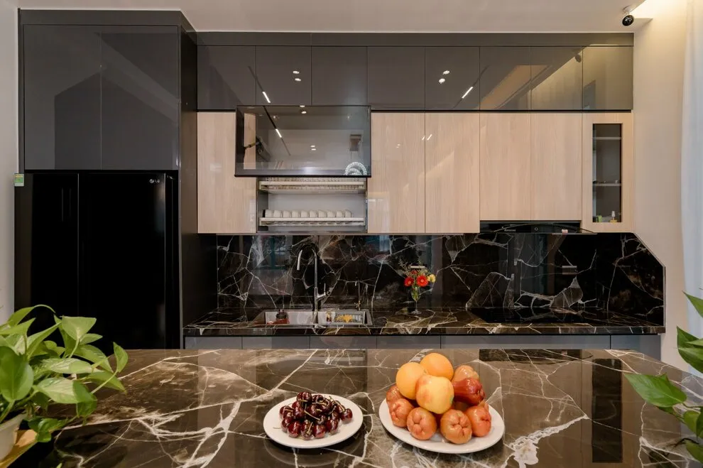 Gian bếp được trang bị đầy đủ nội thất hiện đại bao gồm bếp từ, tủ lạnh dung tích lớn để bảo quản thực phẩm, ấm siêu tốc và bộ nồi niêu, bát đũa được chuẩn bị sẵn sàng cho 28 người sử dụng.