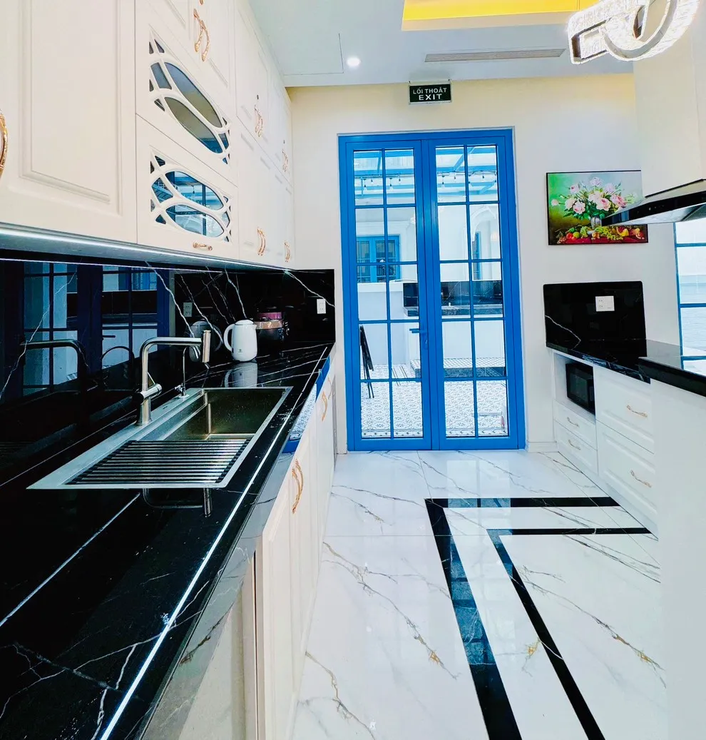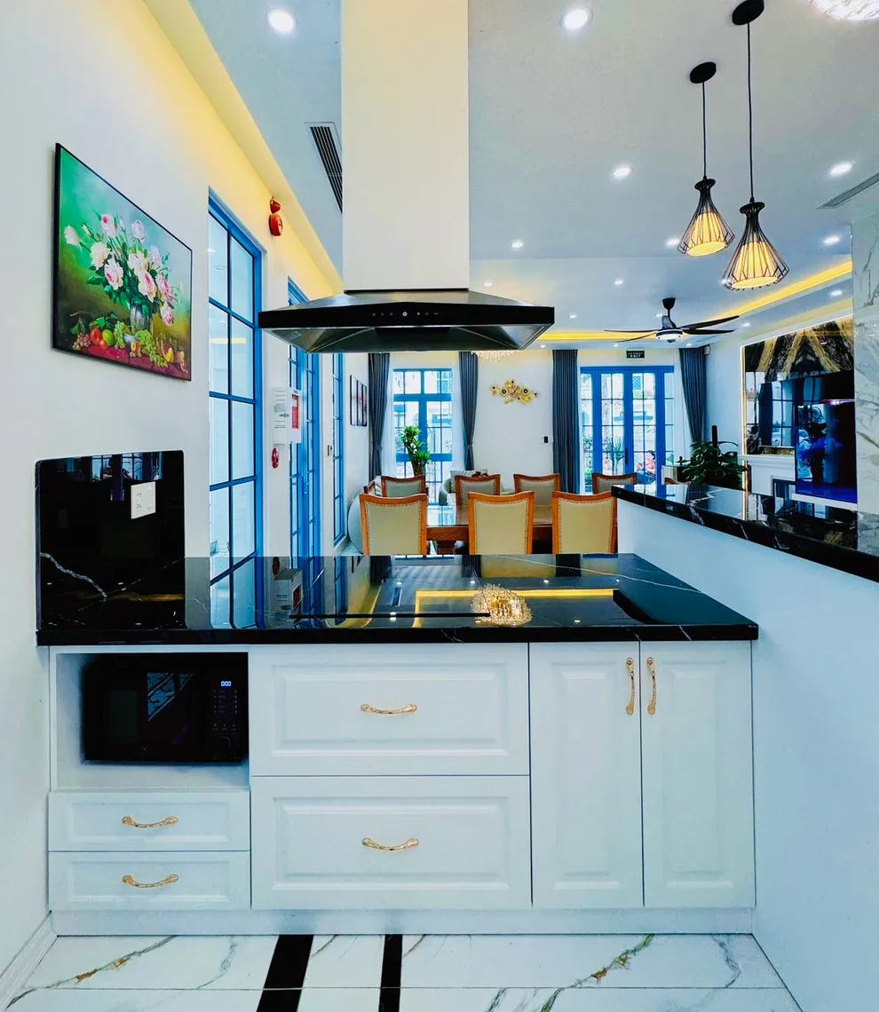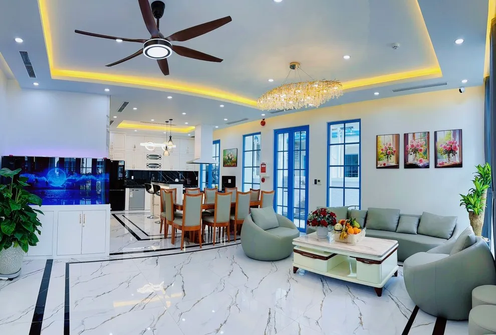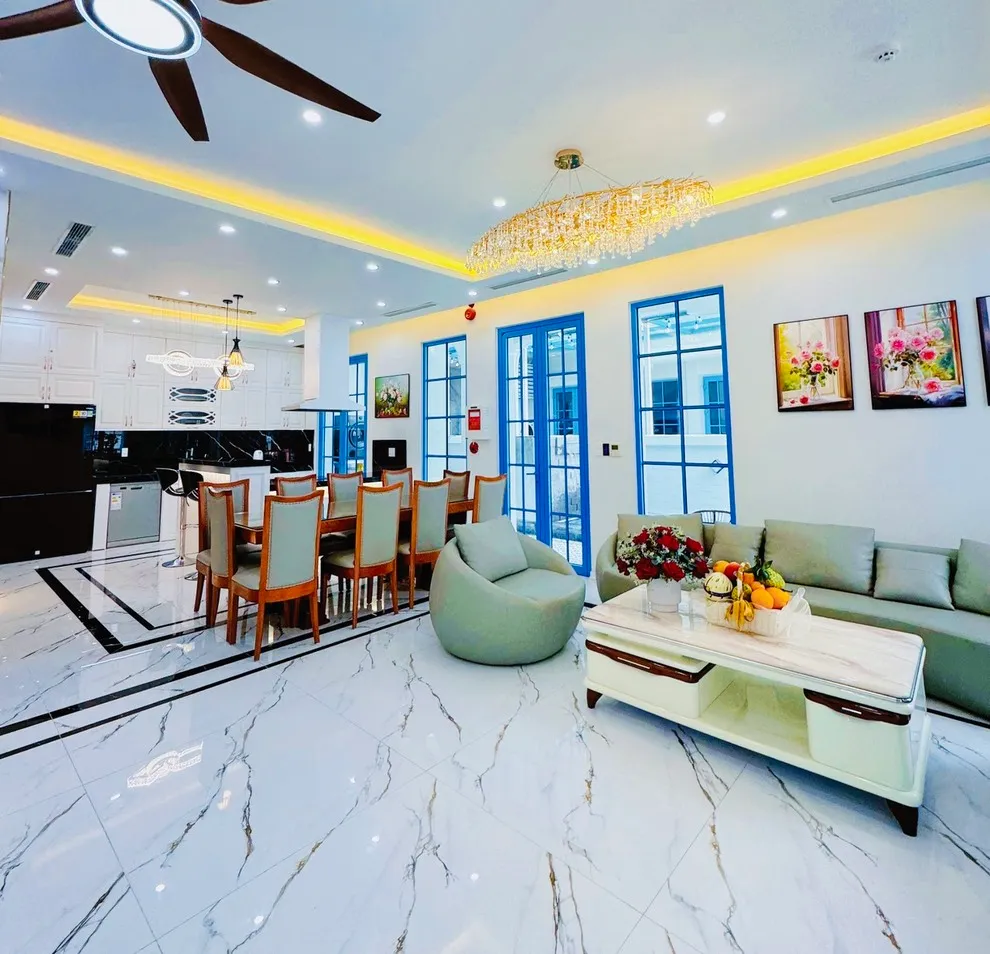 Không gian sinh hoạt chung tại biệt thự được thiết kế vô cùng phóng khoáng và tiện nghi với phòng khách rộng rãi cùng hệ thống loa Karaoke công suất lớn, sẵn sàng cho những buổi tiệc âm nhạc sôi động. Khu vực ẩm thực là điểm cộng lớn khi sở hữu cả bếp nấu hiện đại trong nhà lẫn khu vực bếp ngoài trời rộng rãi, đi kèm đầy đủ dụng cụ từ bếp từ, lò vi sóng đến bếp nướng than hoa, đáp ứng trọn vẹn nhu cầu tổ chức các bữa tiệc BBQ thịnh soạn hay những bữa cơm gia đình ấm cúng.