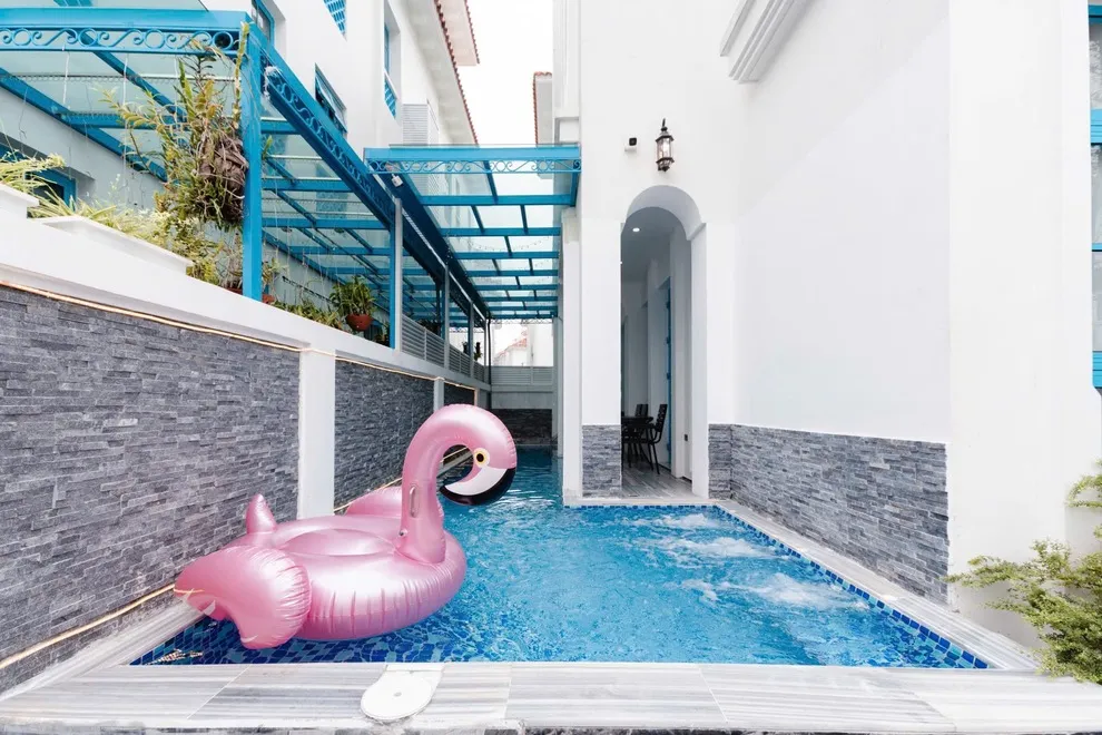 Bể bơi có độ sâu tiêu chuẩn khoảng 1.2m - 1.4m (mức phổ biến tại các villa gia đình). Bể không chia vách ngăn trẻ em riêng biệt, nên gia đình vui lòng luôn để mắt và trang bị phao bơi cho các bé khi xuống nước.