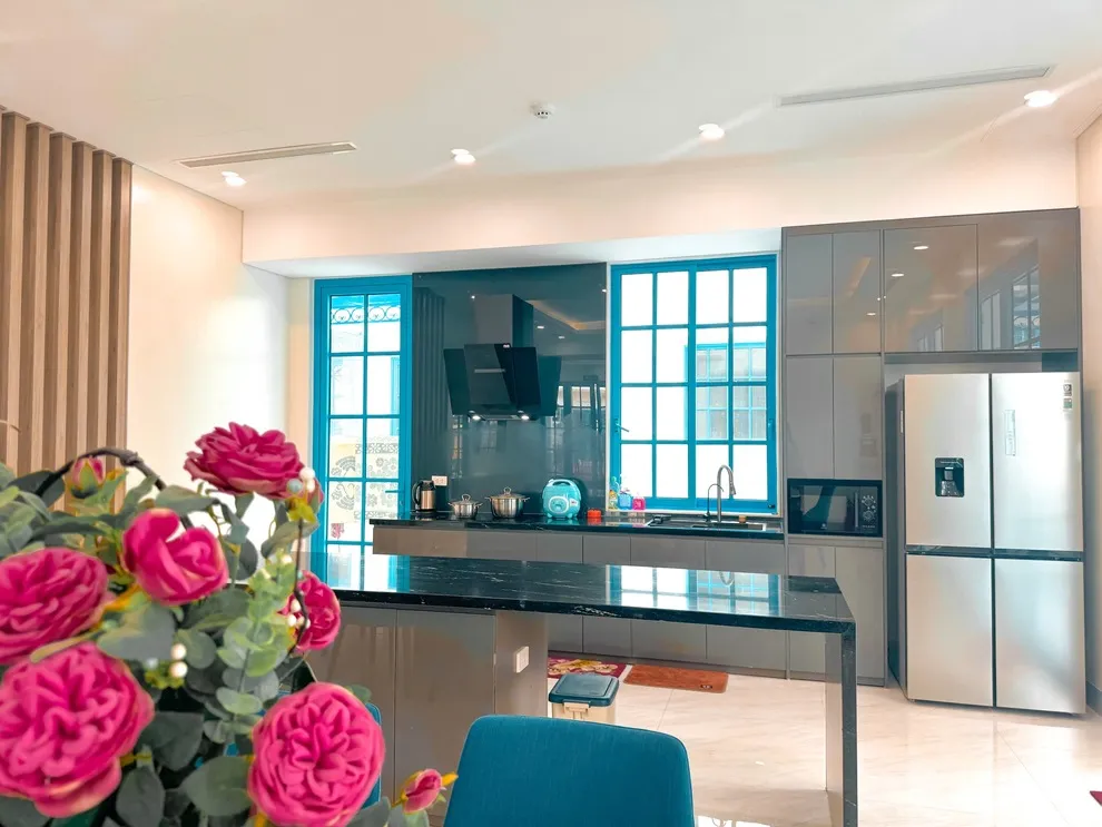 3.1 Quyền lợi: Quý khách được sử dụng toàn bộ tiện nghi bếp (bếp từ, nồi cơm, lò vi sóng…), bếp nướng BBQ và miễn phí nước lọc bình 20L.