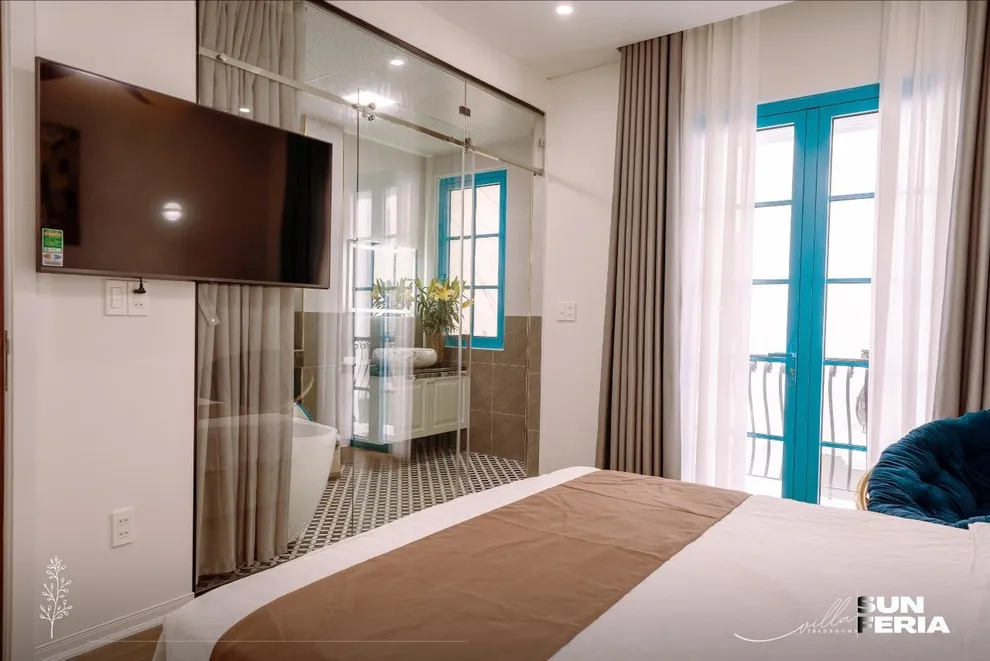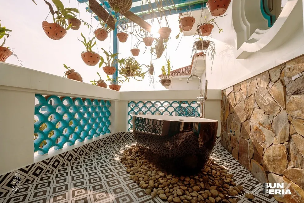 Khu vực bồn tắm ngoài trời được thiết kế ở góc ban công chill và thoáng đãng. Tuy nhiên, vì là không gian mở hướng thiên nhiên, chúng tôi khuyến khích Quý khách nên mặc đồ bơi (bikini) khi ngâm mình để vừa có những bức ảnh đẹp, vừa đảm bảo sự riêng tư, thoải mái nhất.