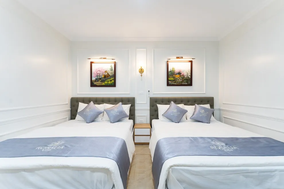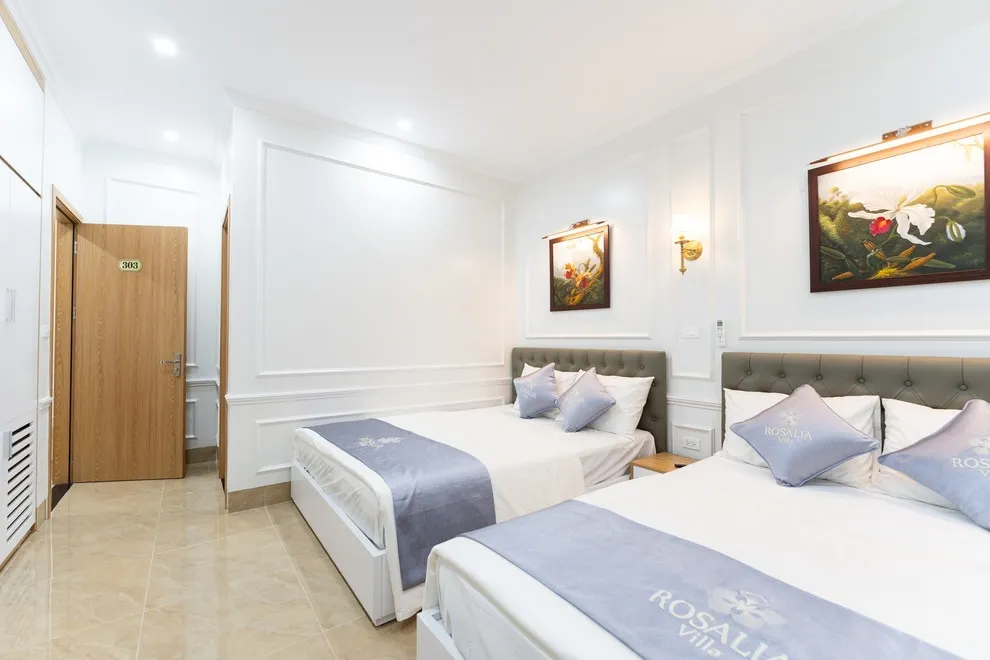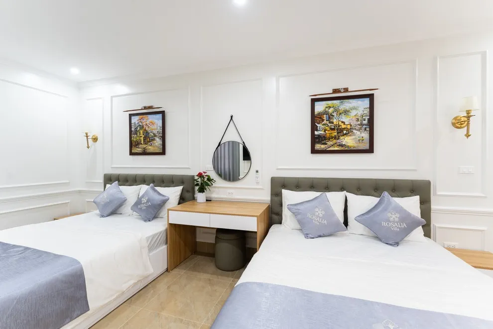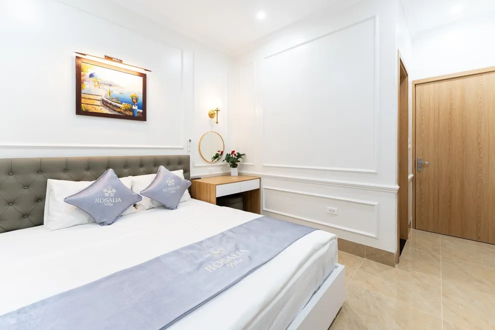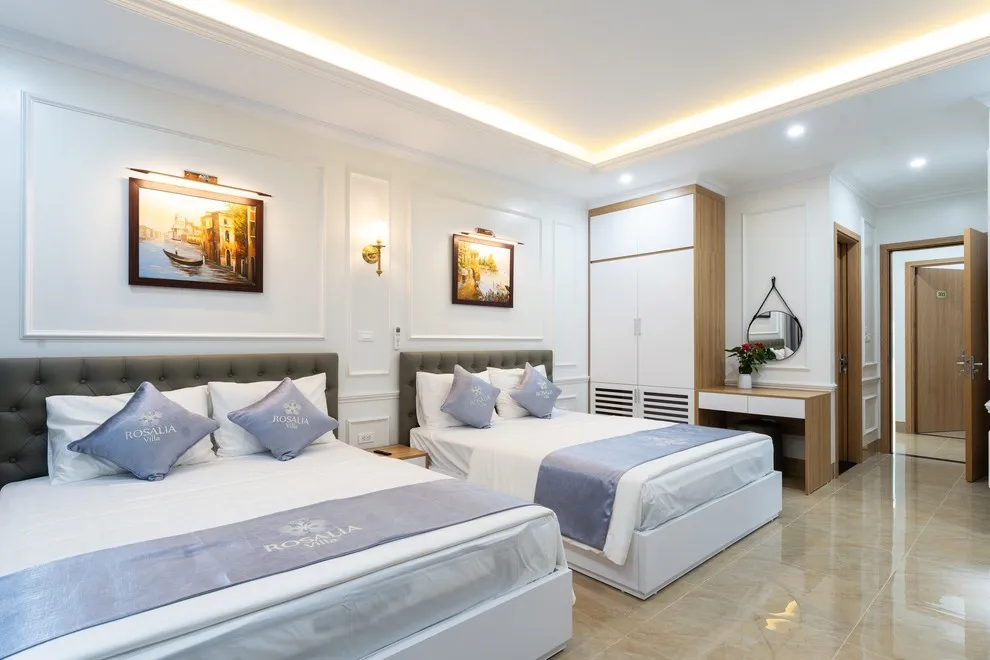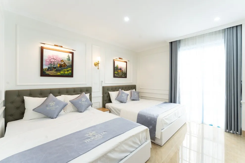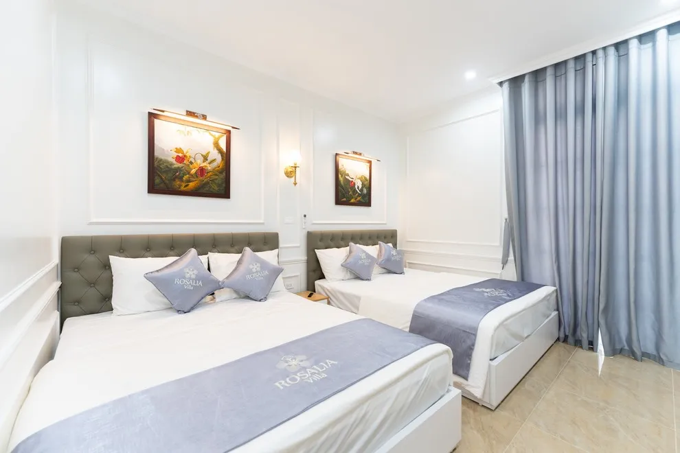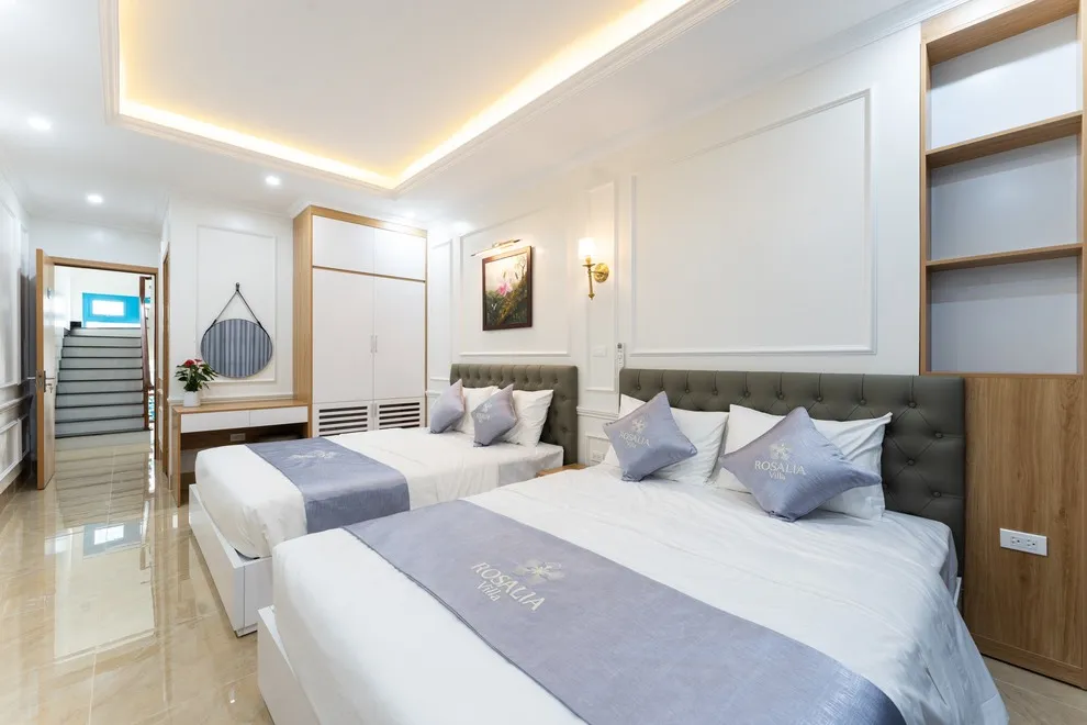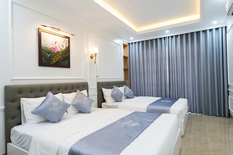 Villa có tổng cộng 6 phòng ngủ với 11 giường. Cụ thể gồm 5 phòng đôi (mỗi phòng 2 giường 1m6) và 1 phòng đơn (1 giường 1m8), giúp đoàn 22 người có không gian ngủ rộng rãi mà không cần kê thêm đệm phụ quá nhiều.