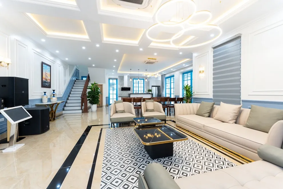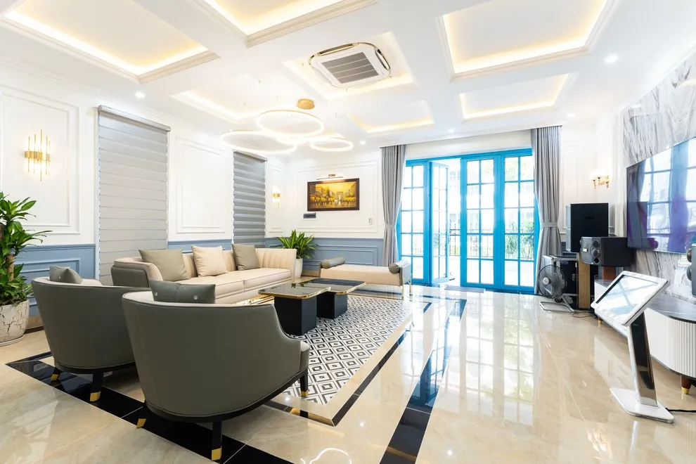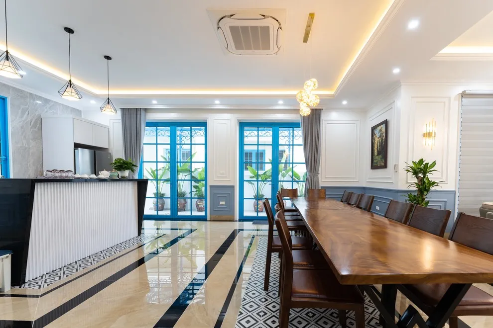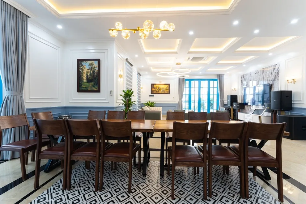 Không gian sinh hoạt chung tại biệt thự được thiết kế để trở thành tâm điểm của sự gắn kết. Phòng khách rộng rãi sở hữu Smart TV siêu to cùng dàn karaoke xịn xò, sẵn sàng cho những buổi tối bùng nổ âm nhạc và niềm vui. Ngay cạnh đó, khu vực bếp và phòng ăn hiện đại được trang bị đầy đủ mọi dụng cụ nấu nướng, từ tủ lạnh, bếp từ đến bếp nướng BBQ và bát đũa đủ cho đoàn lên tới 30 người. Cho dù bạn muốn tự tay trổ tài nấu nướng hay trải nghiệm các dịch vụ đẳng cấp như Tiệc Gala Dinner, Tiệc Finger Food hay setup tiệc trà chuyên nghiệp, villa đều sẵn sàng hỗ trợ để mang lại trải nghiệm ẩm thực tinh tế nhất.