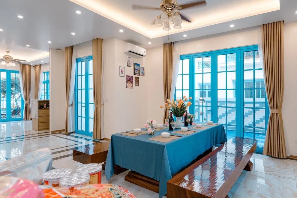 Không chỉ ghi điểm ở không gian nghỉ ngơi, Villa M 334 còn là thiên đường giải trí tại gia. Trung tâm của ngôi nhà là phòng khách sang trọng được trang bị sẵn dàn loa Karaoke xịn sò và Bàn Bi-a tiêu chuẩn, nơi các “cơ thủ” và “ca sĩ” nghiệp dư trong đoàn thỏa sức trổ tài. Bước ra ngoài sân vườn là bể bơi riêng xanh mát, nơi lý tưởng để cả đoàn vẫy vùng xua tan cái nóng mùa hè. Khu vực bếp và BBQ ngoài trời cũng được gia chủ trang bị “tận răng” từ bếp từ, lò vi sóng đến bát đũa, gia vị… sẵn sàng cho những bữa đại tiệc hải sản nướng thơm lừng giữa không khí biển trong lành.
