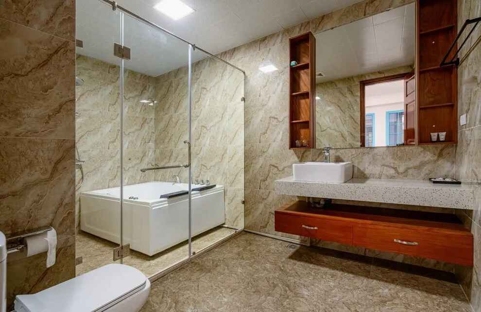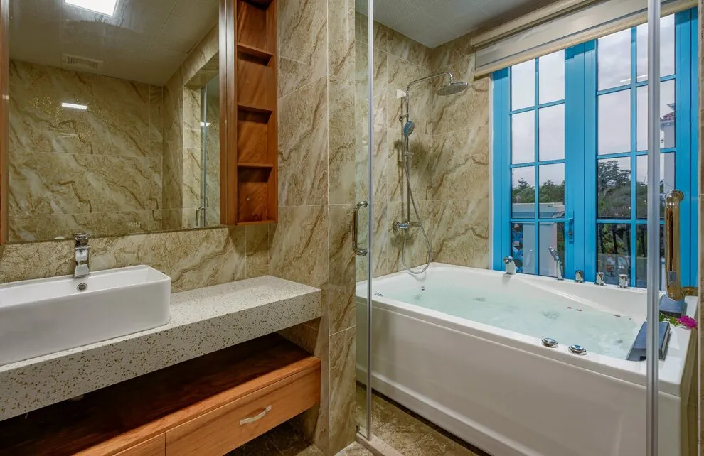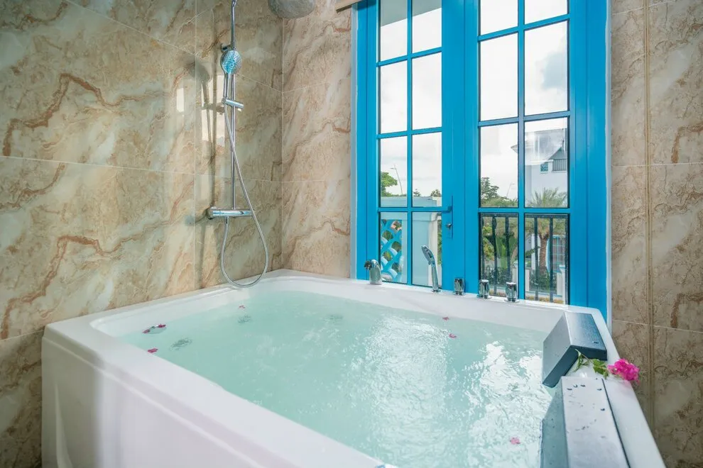 Villa sở hữu tới 02 bồn sục Jacuzzi hiện đại trong phòng tắm để Quý khách thư giãn massage. Villa đã có sẵn khăn tắm, dầu gội, sữa tắm. Nếu Quý khách muốn trải nghiệm tắm bồn tạo bọt lãng mạn, Quý khách có thể tự chuẩn bị thêm "Bomb tắm" (Bath bomb) hoặc tinh dầu yêu thích mang theo nhé.