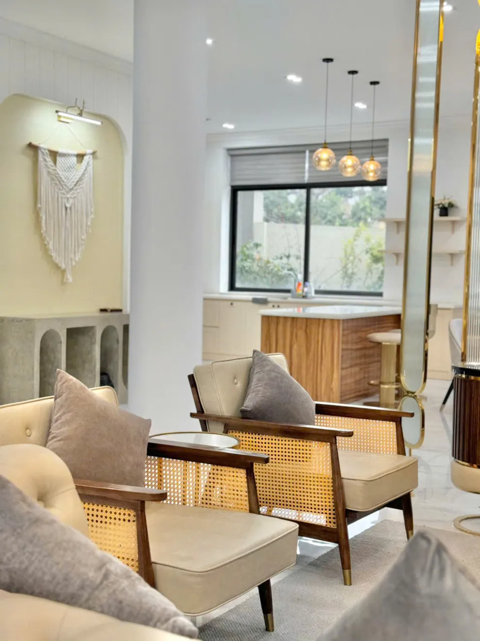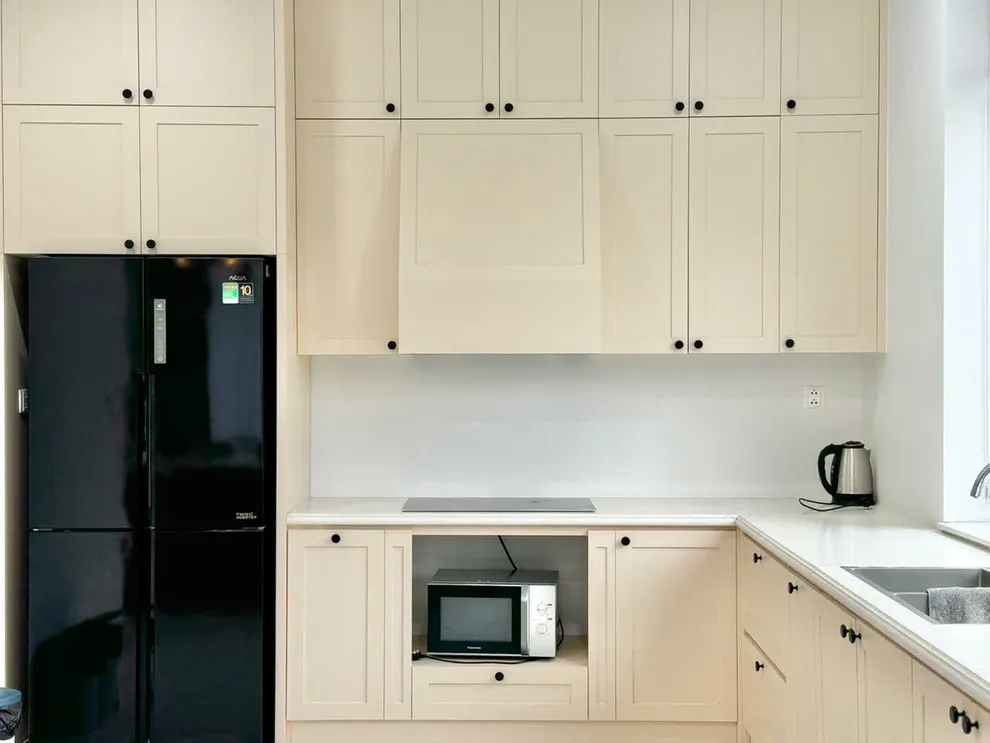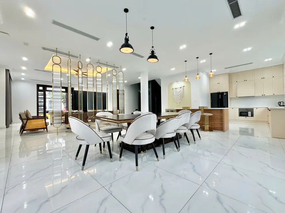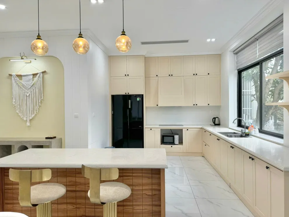 Không gian sinh hoạt chung được thiết kế rộng mở từ phòng khách thoáng đãng cho đến phòng bếp hiện đại, tạo điều kiện thuận lợi để du khách tổ chức những buổi sum họp ấm cúng. Tại đây, bạn có thể tự tay chuẩn bị những bữa tiệc hải sản tươi ngon với đầy đủ dụng cụ nấu nướng có sẵn, giúp kỳ nghỉ thêm phần trọn vẹn và gần gũi như đang ở chính ngôi nhà của mình giữa lòng thành phố di sản.