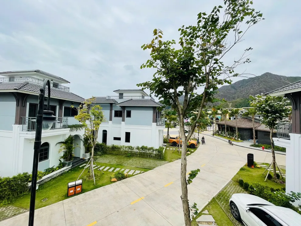Đường nội khu phía trước villa rất thoáng, quý khách có thể đỗ 02 xe ô tô con ngay tại cửa. Các xe bổ sung có thể đỗ tại bãi đỗ xe chung miễn phí của dự án gần đó với sự hướng dẫn của bảo vệ.
