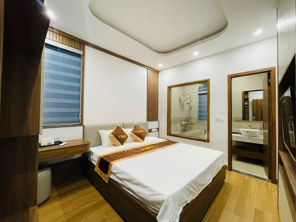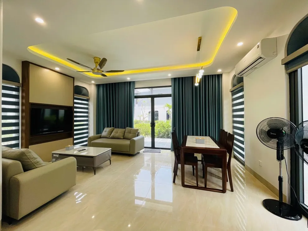 Về cấu trúc, Villa V3M05 được thiết kế với 4 phòng ngủ và 4 giường lớn, cung cấp không gian nghỉ ngơi riêng tư hoàn hảo cho các đại gia đình hoặc nhóm bạn từ 8 đến 10 người. Tầng trệt của biệt thự là không gian sinh hoạt chung rộng mở, kết nối phòng khách sang trọng và khu vực bếp hiện đại theo mô hình “Homeliday”. Với diện tích sử dụng lớn hơn các căn 3 phòng ngủ, V3M05 mang lại cảm giác thoải mái, không hề chật chội ngay cả khi tất cả các thành viên cùng quây quần bên bữa tiệc gia đình.