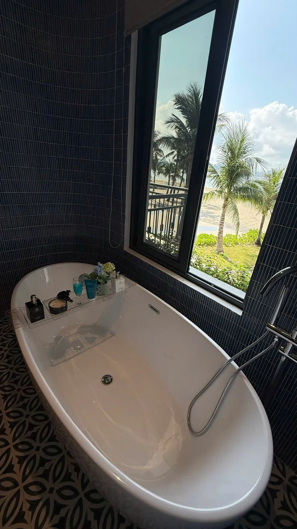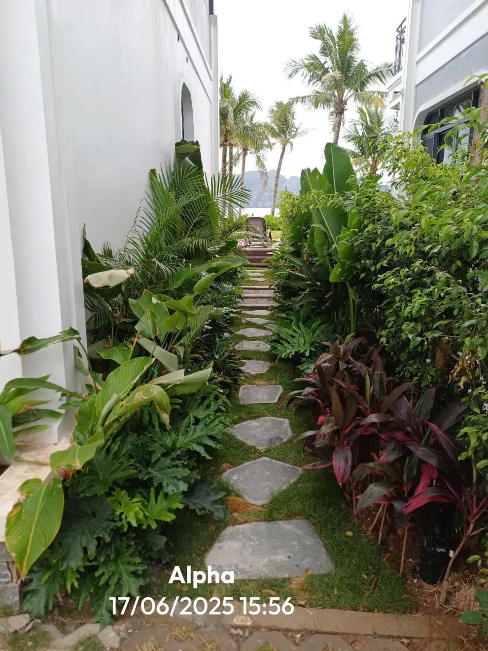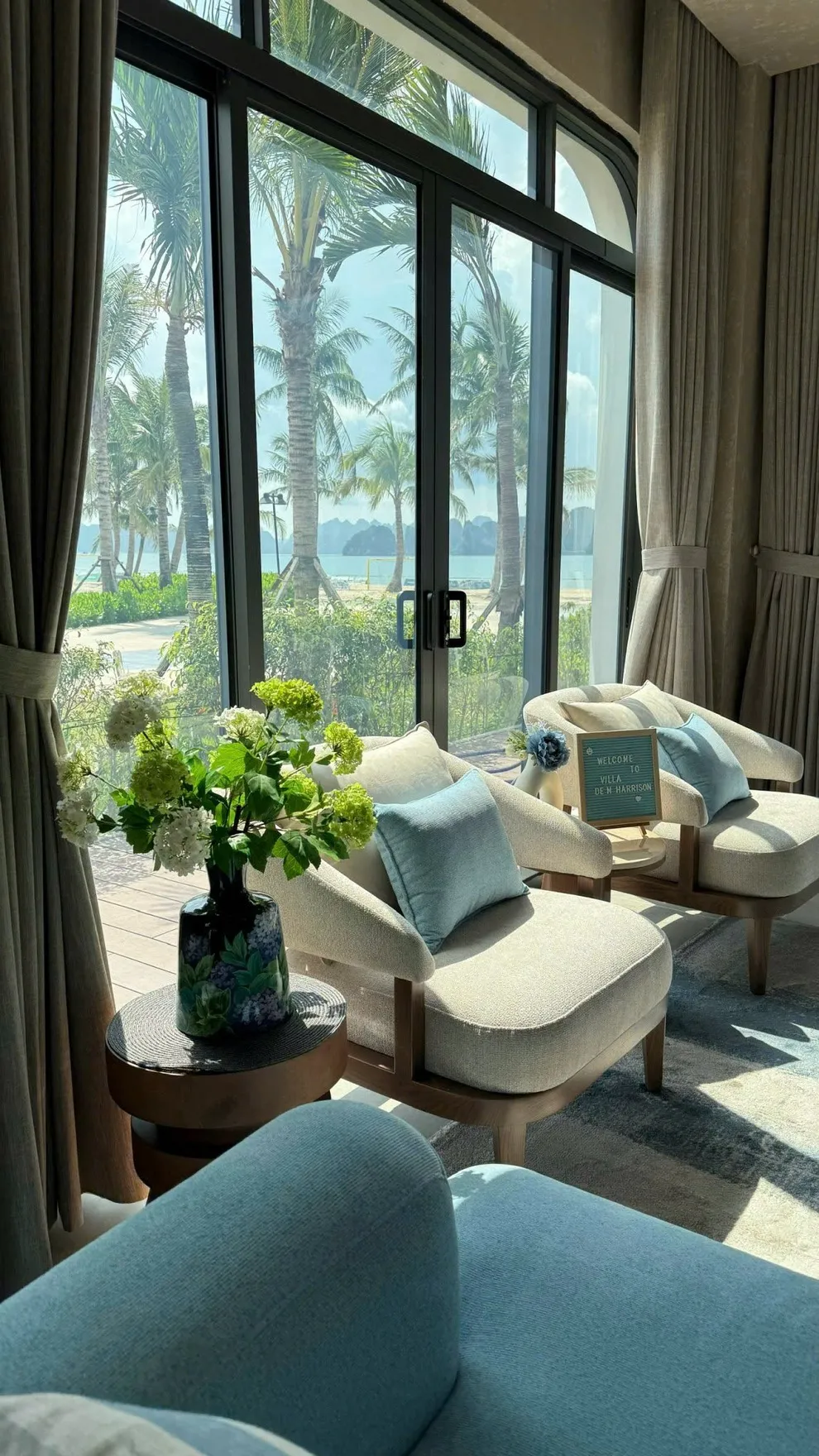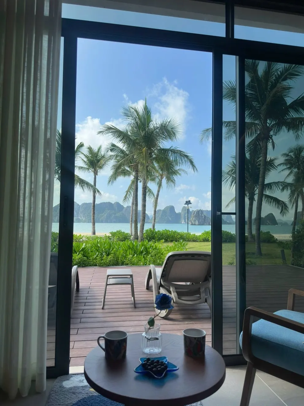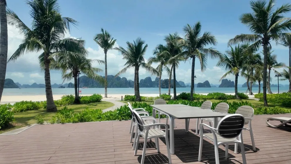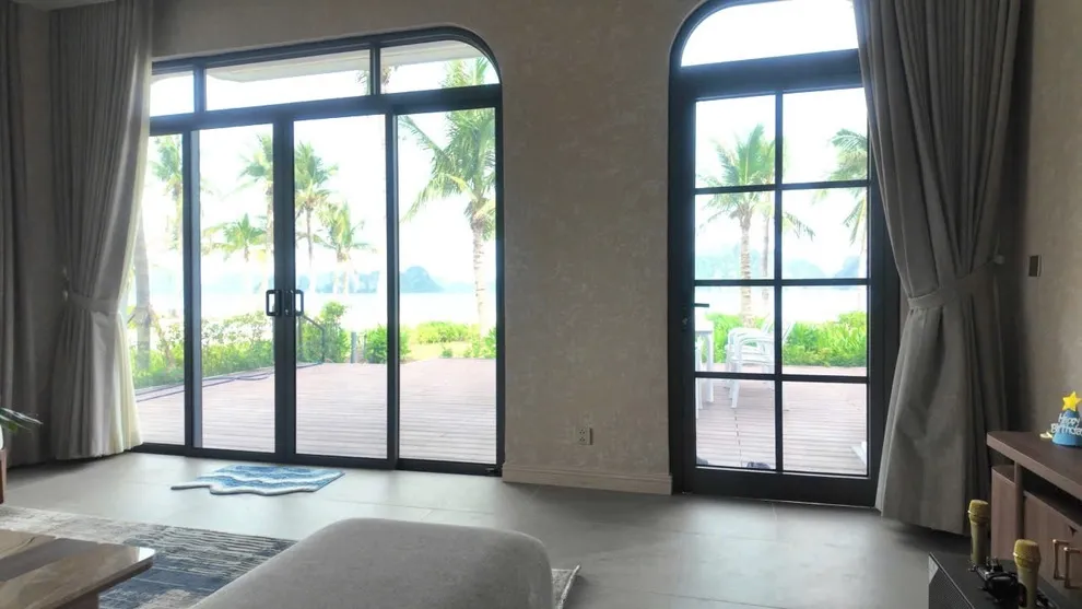 V3R03 nằm ở dãy đầu tiên, sát mép nước nhất. Từ sân vườn villa, bạn có lối đi trực tiếp ra bãi cát. Tầm nhìn từ phòng khách và ban công là toàn cảnh biển Bái Tử Long, không bị che chắn bởi bất kỳ công trình nào.